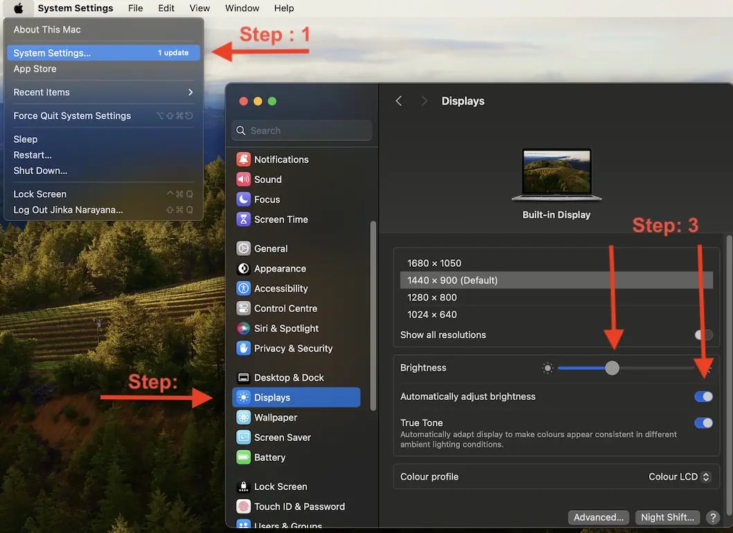 3. Es posible habilitar "ajustar automáticamente el brillo" para que su Mac relegue el brillo de la pantalla de acuerdo con la iluminación de su habitación. Si lo desea, puede ajustar manualmente el brillo. Simplemente arrastre el cursor para ajustar el brillo.