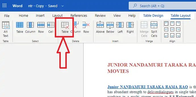 Al hacer clic en la tabla de la tabla, puede ver varias opciones para selección, eliminación e inserción de tablas. Ahora en la sección Eliminar, puede ver las opciones para eliminar una tabla, una línea, una columna, etc. Haga clic Mesa La opción de esa sección se elimina.