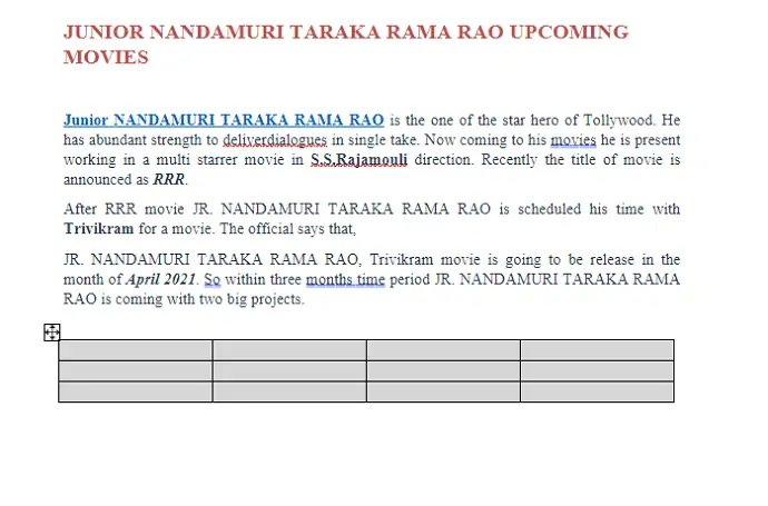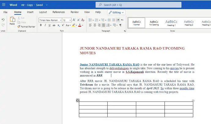 Lo primero que debe hacer es abrir el documento de Microsoft 365 Word en el que tiene una tabla. Mueva el cursor al lugar donde tiene una mesa. Ahora tienes que eliminar esa tabla por algunas razones.